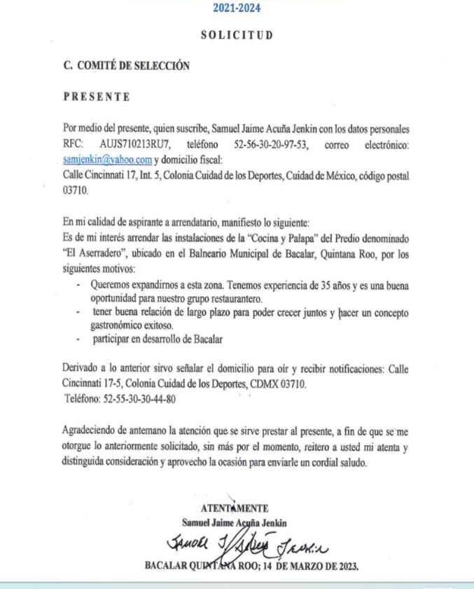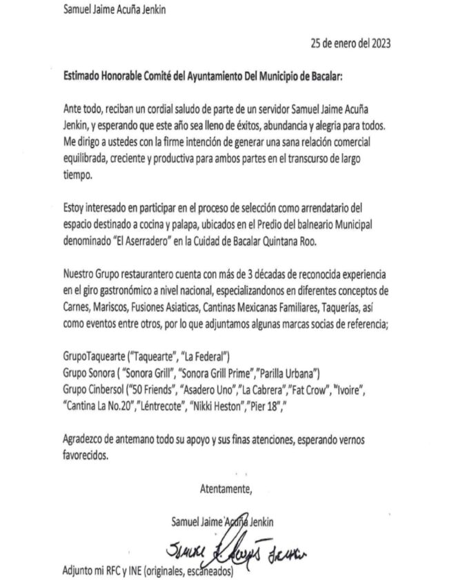 De acuerdo con el expediente, en enero de 2023 Acuña Jenkin solicitó al Ayuntamiento de Bacalar el arrendamiento del balneario “El Aserradero”, presentándose como representante de un supuesto grupo restaurantero con más de 30 años de experiencia y vinculado a marcas nacionales como “Sonora Grill” y “La No. 20”. Sin embargo, el proyecto derivó en la apertura de su propio restaurante, “Itzá Bar & Brasa”, dentro del inmueble municipal, lo que posteriormente generó denuncias por despojo.