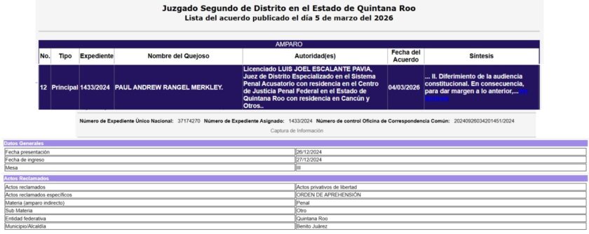 De acuerdo con la revisión de la lista de estrados realizada este jueves por El Despertador, el Juzgado Segundo de Distrito en el Estado de Quintana Roo resolvió aplazar la audiencia constitucional que estaba programada para celebrarse el 4 de marzo de 2026.