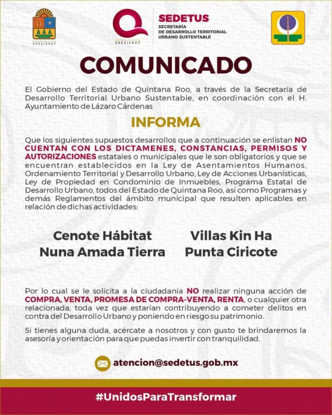 La Secretaría de Desarrollo Territorial Urbano Sustentable (Sedetus), en coordinación con el Ayuntamiento, indicó que los desarrollos identificados como Cenote Hábitat, Nuna Amada Tierra, Villas Kin Ha y Punta Ciricote carecen de dictámenes, constancias y autorizaciones requeridas por la normatividad vigente en Quintana Roo.