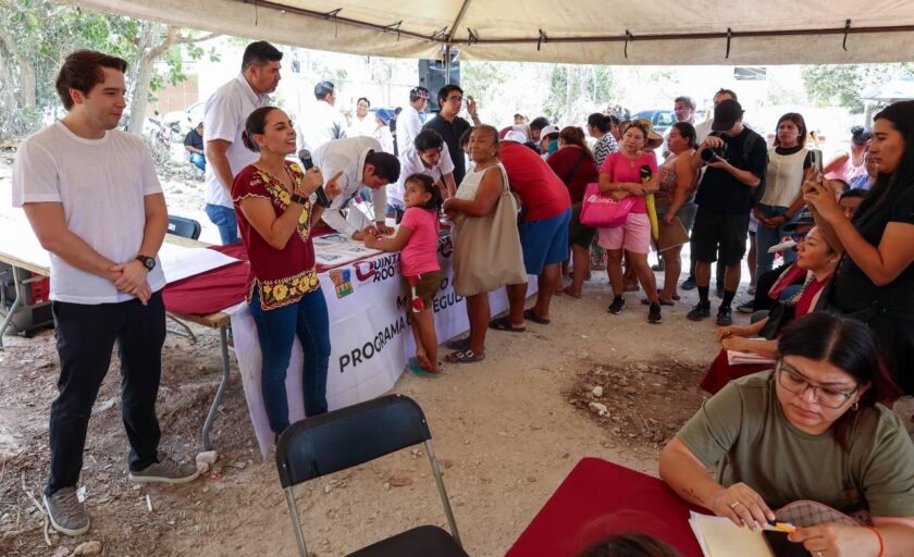 La presidenta municipal Ana Paty Peralta supervisó la instalación del módulo del Programa de Regularización Patrimonial en la colonia Cuna Maya, en la Supermanzana 203, donde dialogó con vecinos que entregaron documentos para iniciar su trámite de escrituración.