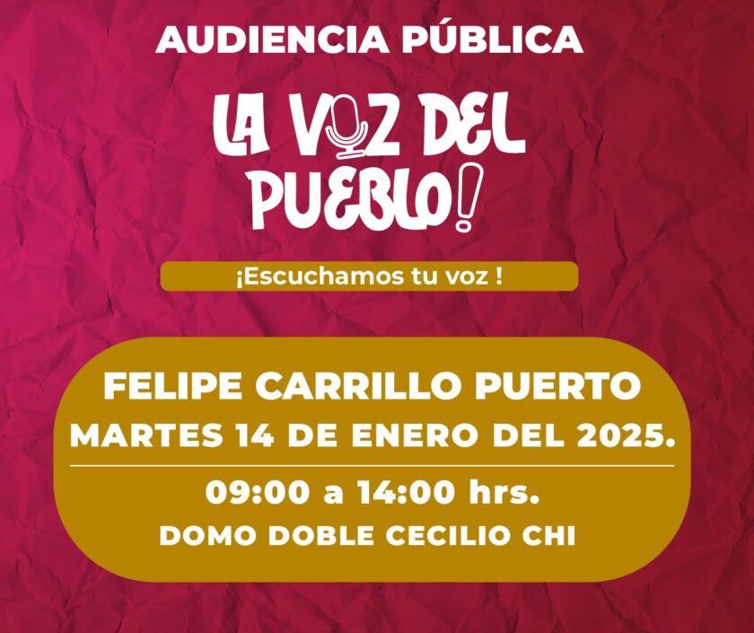 En la primera emisión del 2025 del programa “La Voz del Pueblo”, la mandataria invitó a la población a realizar su prerregistro para la audiencia, disponible desde este lunes 6 de enero en la delegación de la Secretaría de las Mujeres (SEMUJERES) en Felipe Carrillo Puerto o llamando al 983 835 1350, extensión 300 401.