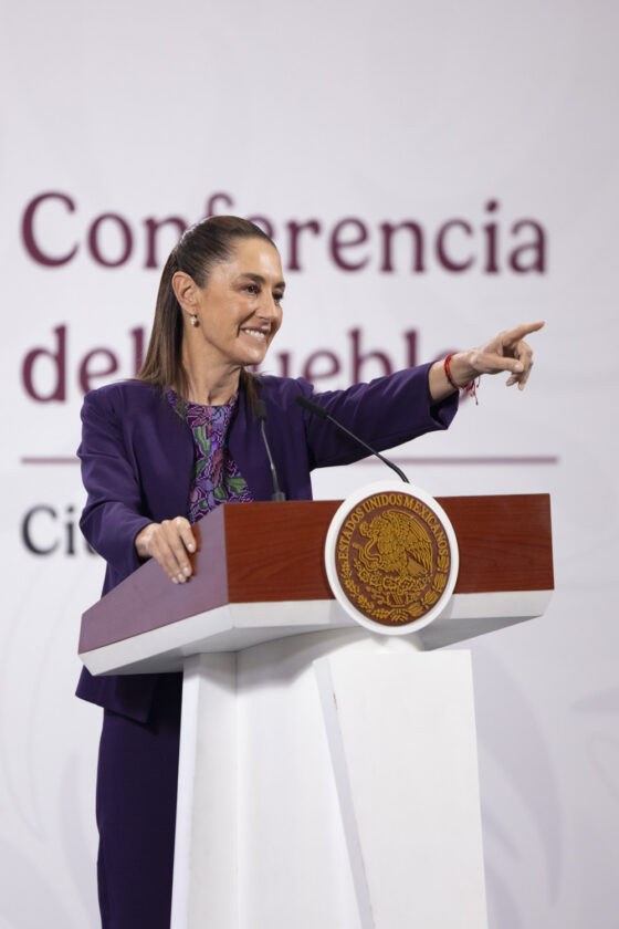 Cuauhtémoc, Ciudad de México, México, 30 de octubre de 2025. La doctora Claudia Sheinbaum Pardo, presidenta Constitucional de los Estados Unidos Mexicanos en conferencia de prensa matutina, “Conferencia del Pueblo” en el Salón Tesorería de Palacio Nacional. La acompañan Octavio Sánchez Guillén, director general del Corredor Interoceánico del Istmo de Tehuantepec y Noemí Juárez Pérez, subsecretaria de Educación Pública. Foto: Gabriel Monroy / Presidencia