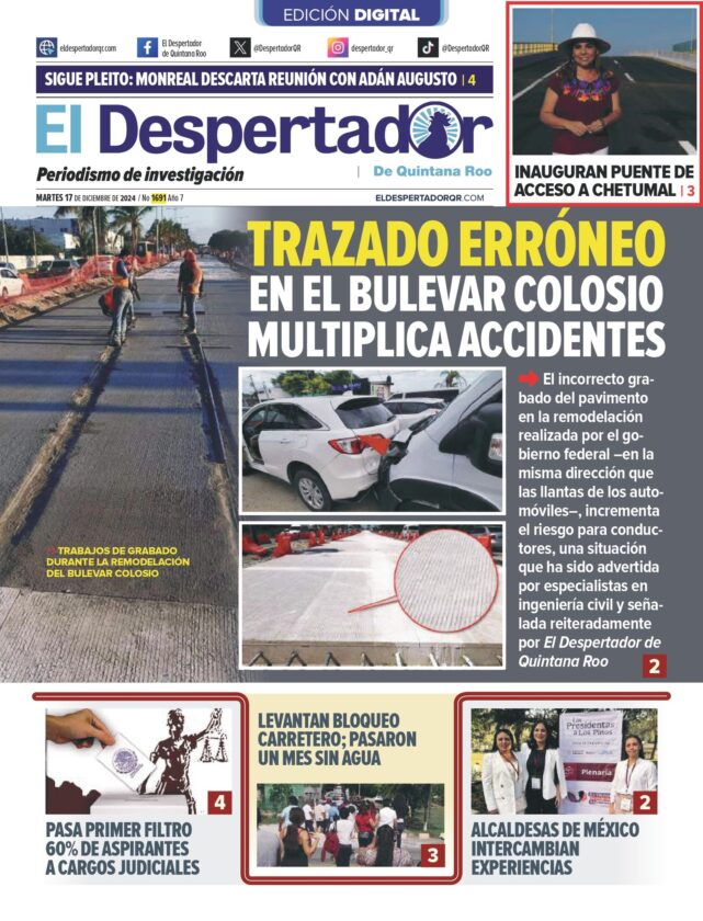 “El trazo del pavimento afecta directamente la adherencia de las llantas al suelo, exponiendo a los conductores a un riesgo constante”, señalaron ingenieros consultados por El Despertador de Quintana Roo, medio que desde octubre de 2022 ha denunciado públicamente irregularidades mientras la obra aún estaba en proceso.