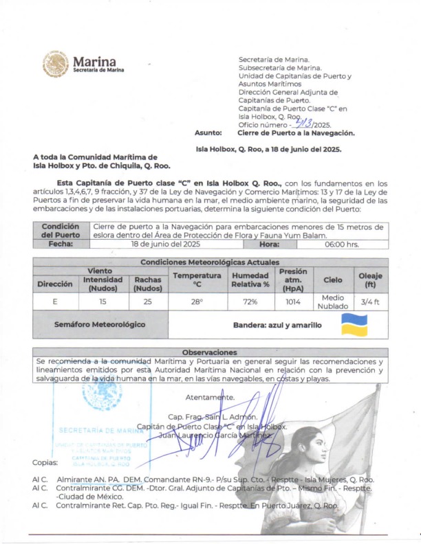 Precisó que, de acuerdo con un documento emitido por el capitán de puerto en la isla de Holbox, Juan Laurencio García Martínez, se recomienda a toda la comunidad marítima y portuaria seguir las indicaciones y lineamientos de la autoridad, en relación con la prevención y la salvaguarda de la vida humana en el mar, las vías navegables, costas y playas.