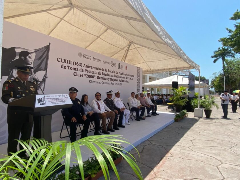 CHETUMAL.– Más de 180 soldados del Servicio Militar Nacional (SMN) Clase 2006, remisos y mujeres voluntarias cumplieron con la ceremonia de Toma de Protesta de Bandera, en la Plaza Cívica de la Bandera frente al Palacio de Gobierno, en Chetumal, encabezada por el General de Brigada Diplomado de Estado Mayor Fidel Mondragón Rivero, comandante de la 34/a Zona Militar, correspondiente al estado de Quintana Roo.