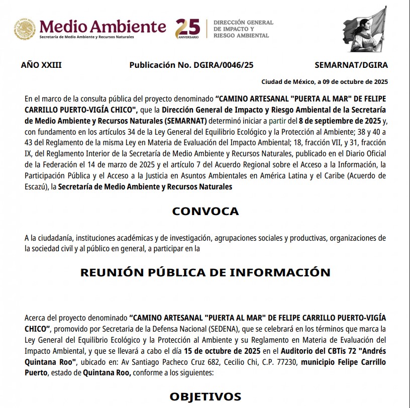 CHETUMAL.- La Secretaría de Medio Ambiente y Recursos Naturales (Semarnat) lanzó la convocatoria para realizar una reunión pública de información sobre el proyecto Puerta al Mar Felipe Carrillo Puerto-Vigía Chico, como parte de la consulta pública de su Manifestación de Impacto Ambiental (MIA), que se realizó del 8 de septiembre al 7 de octubre.