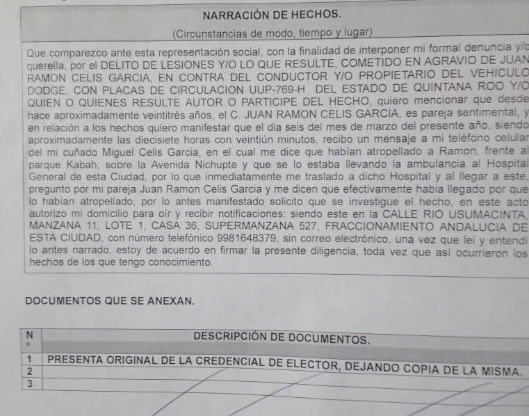 CANCÚN.- En medio de la desesperación y el dolor, la familia del señor Juan Ramón Celis García ha denunciado públicamente la falta de justicia y el abandono por parte de las autoridades, tras el atropellamiento ocurrido el pasado jueves 6 de marzo en la avenida Nichupté, a la altura del Parque Kabah, en Cancún. La responsable del accidente, una mujer que conducía una camioneta Grand Caravan gris con placas UUP769H, se comprometió en el lugar de los hechos a hacerse cargo de los gastos médicos, pero hasta la fecha no ha cumplido su palabra ni ha dado la cara.
