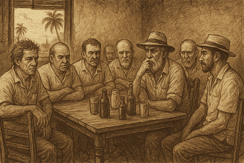 Son alrededor de una decena de hombres de fisonomías contrastantes, que asentaron sus reales en el puerto e hicieron de la cantina un muro de los lamentos que, de tarde en tarde, los reúne. Sus vestimentas son tan diversas como sus facciones, y algunos muestran en sus semblantes marchitos y en sus brazos tostados por el sol las huellas de muchas horas a la intemperie. A veces, mientras parlotean, los imagino como una minúscula representación del mundo, y termino preguntándome: ¿cómo carambas llegaron hasta acá? En el fondo, son prófugos de la desventura, un puñado de desarraigados que, acaso, encontraron entre estas murallas el remanso que en algún mal momento les arrebató la vida.