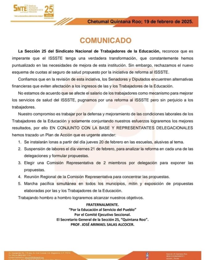 Por ello, la Sección 25 del Sindicato Nacional de Trabajadores de la Educación (SNTE) confirmó que este viernes 21 de febrero se suspenden las clases en escuelas públicas de toda la entidad, como parte de un plan de acción para expresar su inconformidad con la reforma. Además del paro, se prevé la instalación de lonas informativas en planteles, marchas pacíficas en Cancún, Chetumal, Playa del Carmen y Tulum, así como un mitin donde se presentarán sus exigencias.