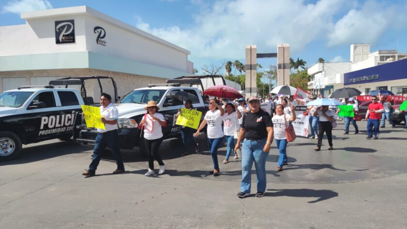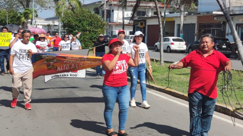 Con mantas, pancartas, cantos y consignas, los profesores y profesoras afiliados a la CNTE se concentraron en la plaza cívica del Congreso del Estado, donde mantienen un plantón permanente y desde ahí partieron en contingentes para marchar por las principales avenidas del centro histórico de Chetumal.