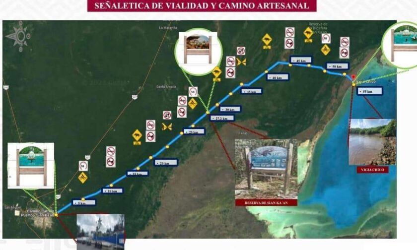De manera escueta, la Gaceta Ambiental describe que el proyecto, denominado “Camino artesanal Puerta al Mar de Felipe Carrillo Puerto–Vigía Chico”, contempla la construcción de una carretera de 54.669 kilómetros dividida en dos tramos. El primero será asfaltado, con 22.40 kilómetros de longitud, 6 metros de carril vehicular y 2 metros de ciclovía. El segundo tramo, de 32.079 kilómetros, será un camino artesanal de concreto hidráulico de 6 metros de ancho para tránsito vehicular.
