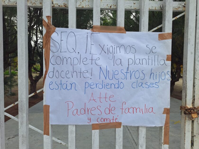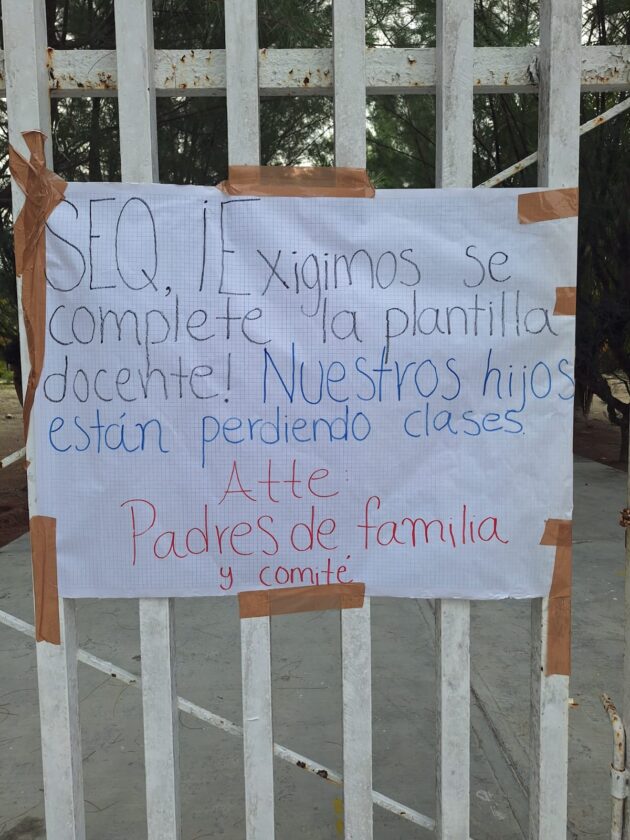 Los inconformes colocaron pancartas en la entrada del plantel para exigir a la Secretaría de Educación de Quintana Roo (SEQ), encabezada por Elda Xix Euan, que se complete la plantilla docente, ya que sus hijos llevan semanas sin recibir clases en esas materias.