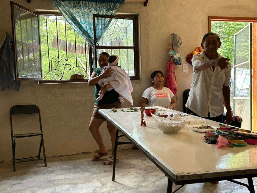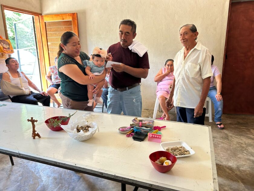 Recientemente, la familia Balam Vásquez, acompañada de sus padrinos, realizó esta ceremonia para su hija menor de tres meses. Durante el ritual, la bebé fue cargada sobre la cadera izquierda, mientras se daban vueltas alrededor de una mesa con herramientas como un machete y una escoba, así como alimentos como huevo, pepita de calabaza y sal. En cada vuelta, se entregaban al bebé objetos simbólicos acompañados de una explicación de su significado.