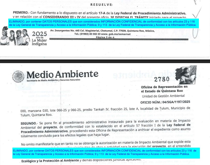 Después de notificar a los desarrolladores el 25 de septiembre, a mediados de octubre la Semarnat hizo públicos los resolutivos, en los que se indica que el motivo del desechamiento fue la falta de información requerida sobre los proyectos, misma que los promotores no entregaron.